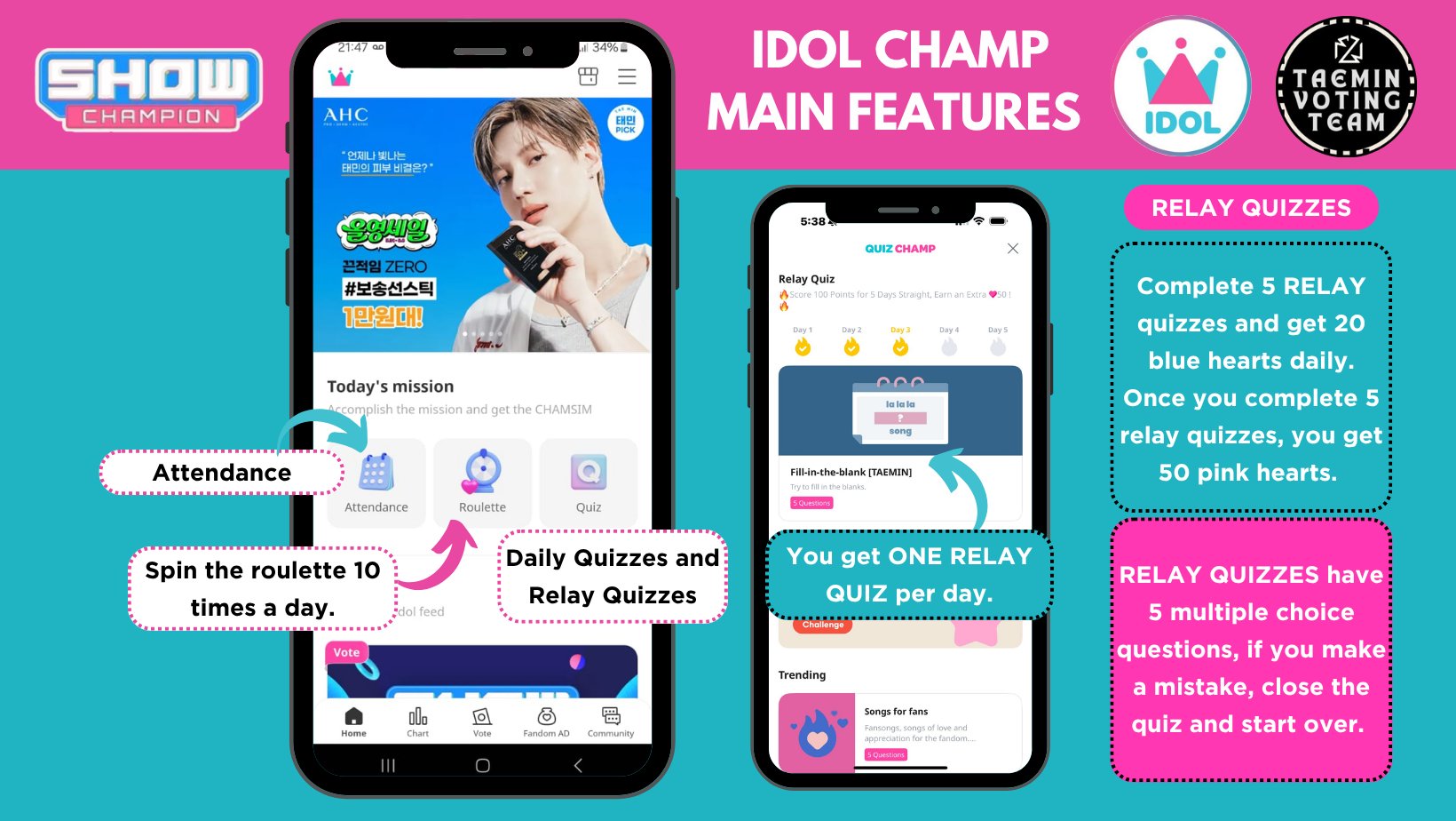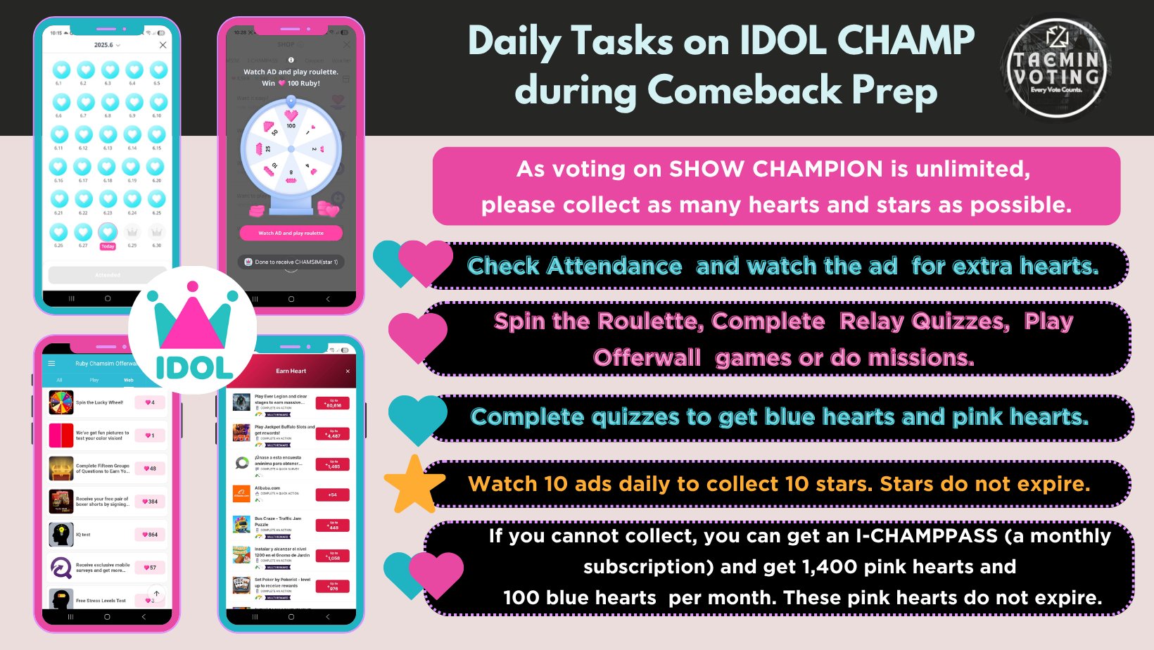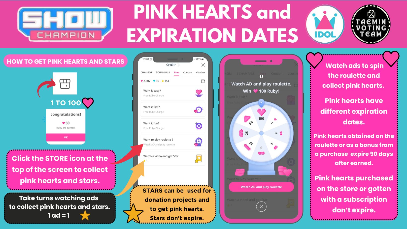 1 ticket = 5 blue heartsWhat to COLLECT on IDOL CHAMPRuby Chamsim (Pink Hearts) - Startting July 28th pink hearts will expire 90 days after being acquiredTime Chamsim (Blue Hearts) expire at the end of the month. They are useful to level up and get more attendance hearts.